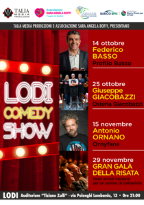 Talia Media Produzioni è lieta di annunciare la prima edizione della rassegna “Lodi Comedy Show”, quattro appuntamenti autunnali, tutti lodigiani, dedicati alla comicità, in programma all’Auditorium “Tiziano Zalli” di Lodi (via Polenghi Lombardo 13).